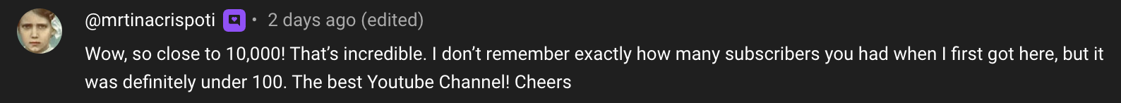 In reality, this milestone is massive. I probably had no more than 100 subscribers when I started uploading weekly last November. Just this past week, one of my longest subscribers left this comment on a video: