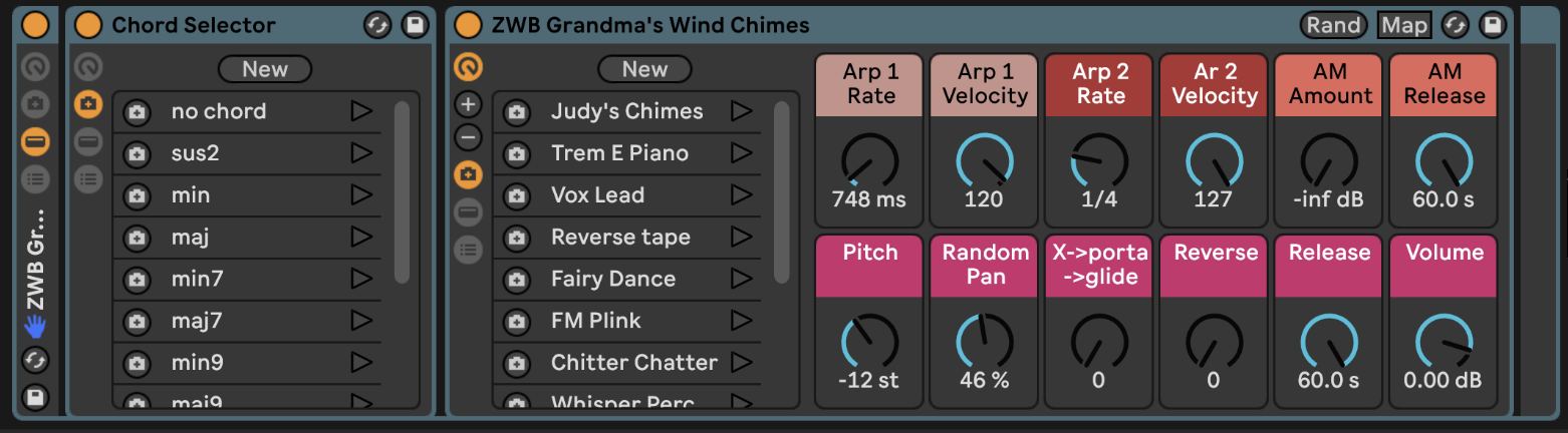 Grandma's Wind Chimes is mapped with 12 macros and comes with 10 patch variations and a chord selector.
