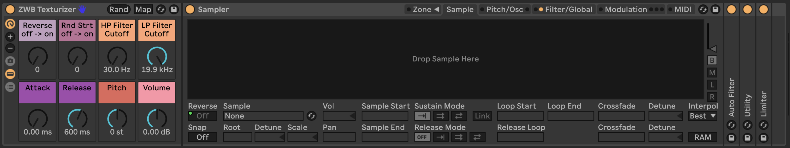 Texturizer is mapped with 8 macros. This Pack includes the default Texturizer rack and six custom Texturizer instances for blending pitched and non-pitched field recordings with your instruments