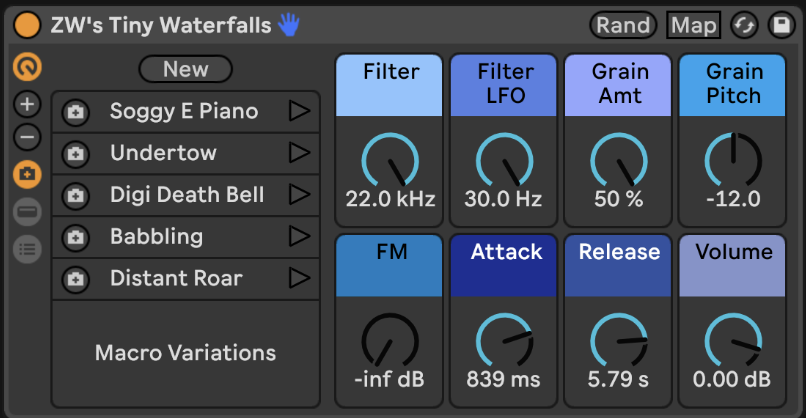 Tiny Waterfalls is mapped with 8 macros and comes with 5 patch variations.